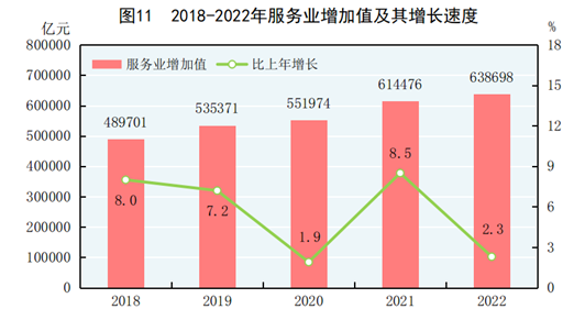 全年批发和零售业增加值114518亿元,比上年增长0.9%;交通运输、仓储和邮政业增加值49674亿元,下降0.8%;住宿和餐饮业增加值17855亿元,下降2.3%;金融业增加值96811亿元,增长5.6%;房地产业增加值73821亿元,下降5.1%;信息传输、软件和信息技术服务业增加值47934亿元,增长9.1%;租赁和商务服务业增加值39153亿元,增长3.4%。全年规模以上服务业企业营业收入比上年增长2.7%,利润总额增长8.5%。