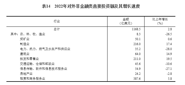 全年对外非金融类直接投资额7859亿元,比上年增长7.2%,折1169亿美元,增长2.8%。其中,对“一带一路”沿线国家非金融类直接投资额1410亿元,增长7.7%,折210亿美元,增长3.3%。