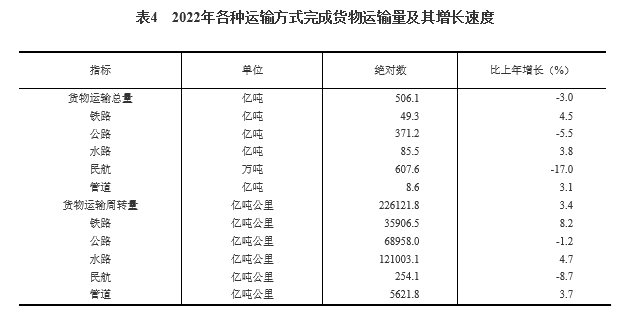 全年货物运输总量506亿吨,货物运输周转量226122亿吨公里。全年港口完成货物吞吐量157亿吨,比上年增长0.9%,其中外贸货物吞吐量46亿吨,下降1.9%。港口集装箱吞吐量29587万标准箱,增长4.7%。