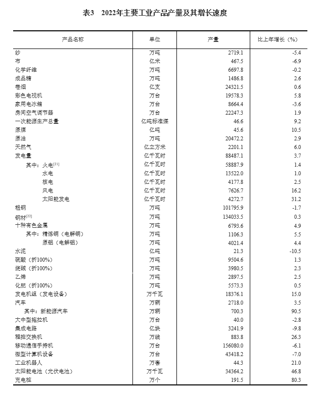 新产业新业态新模式较快成长。全年规模以上工业中,高技术制造业增加值比上年增长7.4%,占规模以上工业增加值的比重为15.5%;装备制造业增加值增长5.6%,占规模以上工业增加值的比重为31.8%。全年规模以上服务业中,战略性新兴服务业企业营业收入比上年增长4.8%。全年高技术产业投资比上年增长18.9%。全年新能源汽车产量700.3万辆,比上年增长90.5%;太阳能电池(光伏电池)产量3.4亿千瓦,增长46.8%。全年电子商务交易额438299亿元,按可比口径计算,比上年增长3.5%。全年网上零售额137853亿元,按可比口径计算,比上年增长4.0%。全年新登记市场主体2908万户,日均新登记企业2.4万户,年末市场主体总数近1.7亿户。