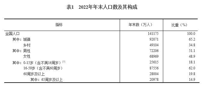 年末全国人口141175万人,比上年末减少85万人,其中城镇常住人口92071万人。全年出生人口956万人,出生率为6.77‰;死亡人口1041万人,死亡率为7.37‰;自然增长率为-0.60‰。