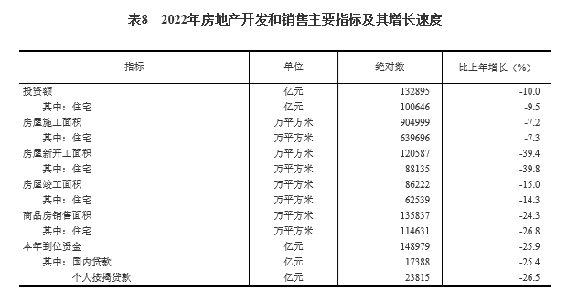 全年房地产开发投资132895亿元,比上年下降10.0%。其中住宅投资100646亿元,下降9.5%;办公楼投资5291亿元,下降11.4%;商业营业用房投资10647亿元,下降14.4%。年末商品房待售面积56366万平方米,比上年末增加5343万平方米,其中商品住宅待售面积26947万平方米,增加4186万平方米。