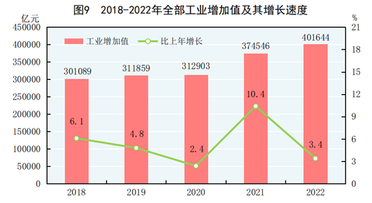 全年全部工业增加值401644亿元,比上年增长3.4%。规模以上工业增加值增长3.6%。在规模以上工业中,分经济类型看,国有控股企业增加值增长3.3%;股份制企业增长4.8%,外商及港澳台商投资企业下降1.0%;私营企业增长2.9%。分门类看,采矿业增长7.3%,制造业增长3.0%,电力、热力、燃气及水生产和供应业增长5.0%。