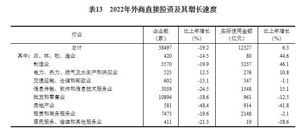全年外商直接投资新设立企业38497家,比上年下降19.2%。实际使用外商直接投资金额12327亿元,增长6.3%,折1891亿美元,增长8.0%。其中“一带一路”沿线国家对华直接投资(含通过部分自由港对华投资)新设立企业4519家,下降15.3%;对华直接投资金额891亿元,增长17.2%,折137亿美元,增长18.6%。全年高技术产业实际使用外资4449亿元,增长28.3%,折683亿美元,增长30.9%。