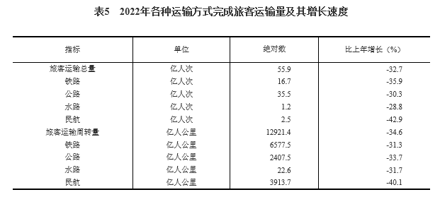 全年旅客运输总量56亿人次,比上年下降32.7%。旅客运输周转量12921亿人公里,下降34.6%。