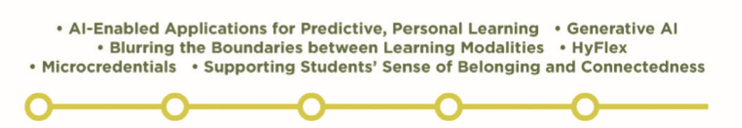 3.打破教学模式界限(Blurring the Boundaries between Learning Modalities)。教学模式定义是不断变化的,因为不同教学模式之间的界限越来越模糊。随着教育技术的发展,为满足学生在混合世界中的需求,课程定位和模式的概念也在不断扩大。今天的教育工作者可以采用跨模式方法设计多种学习环境,满足不同学生群体的需求。